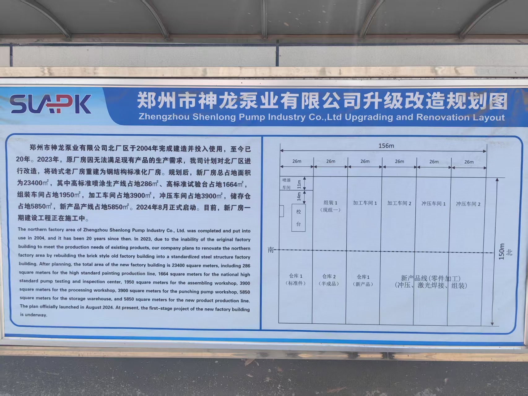 半岛平台北厂区于2004年完成建造并投入使用,至今已20年。2023年,原厂房因无法满足现有产品的生产需求,我司计划对北厂区进行改造,将砖式老厂房重建为钢结构标准化厂房。规划后,新厂房总占地面积为23400㎡,其中高标准喷涂生产线占地286㎡、高标准试验台占地1664㎡组装车间占地1950㎡,加工车间占地3900㎡,冲压车间占地3900㎡,储存仓占地5850㎡,新产品产线占地5850㎡。2024年8月正式启动。目前,新厂房一期建设工程正在施工中。